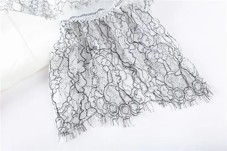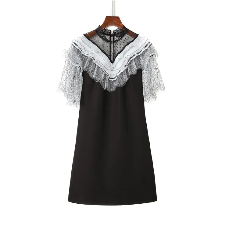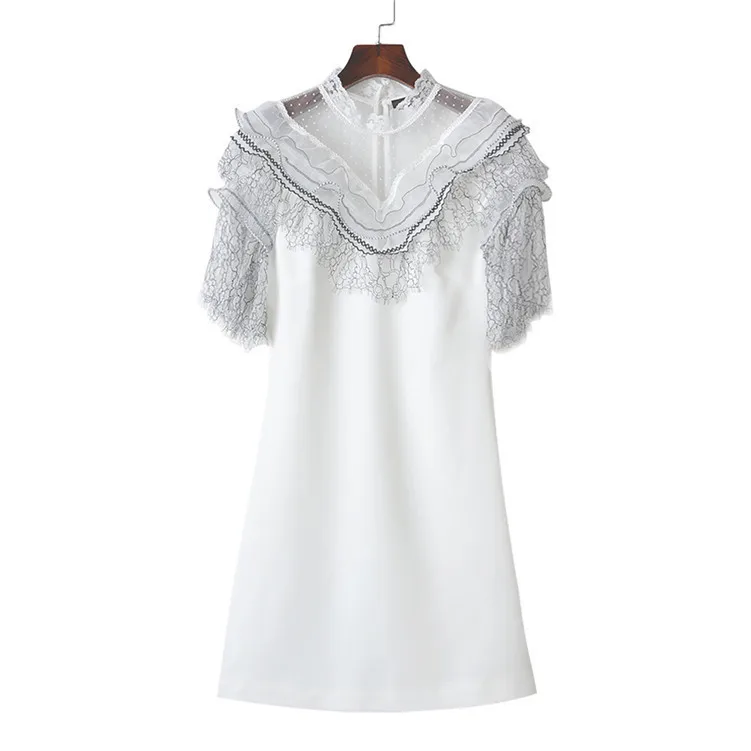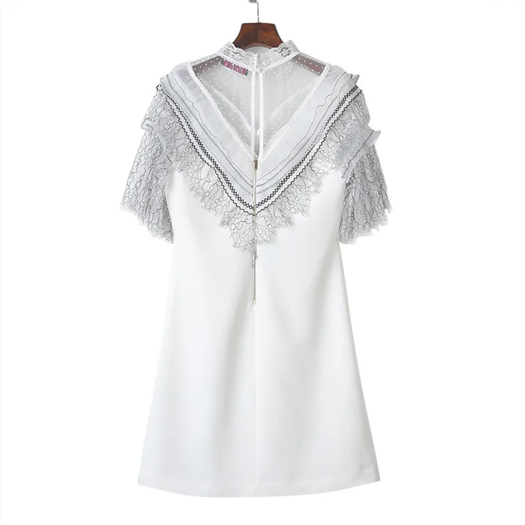 Elegant Lace Patchwork Mini Dress Women White Black Short Sleeve Mesh Female Vintage Travel Party Dresses