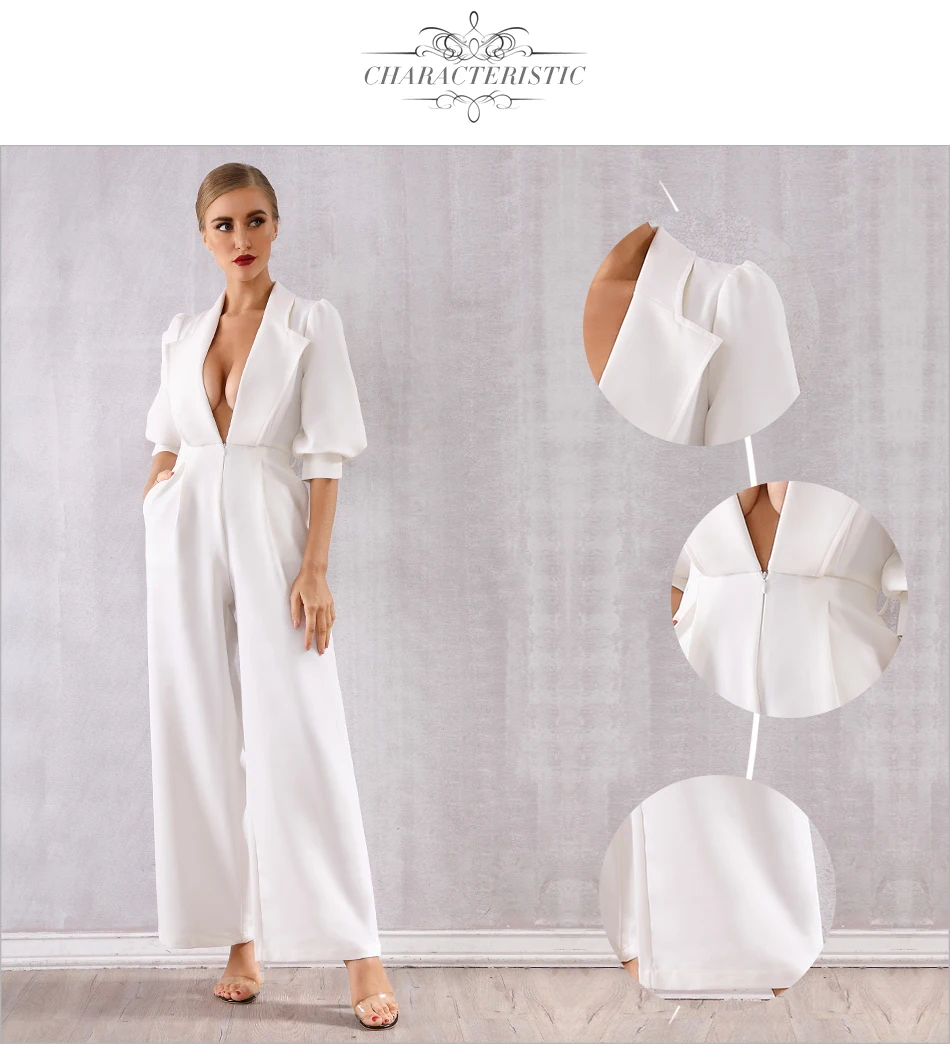 Jumpsuit Women Sexy White Deep V-Neck Long Sleeve Sashes Rompers Jumpsuit Sexy Bodycon Bodysuits