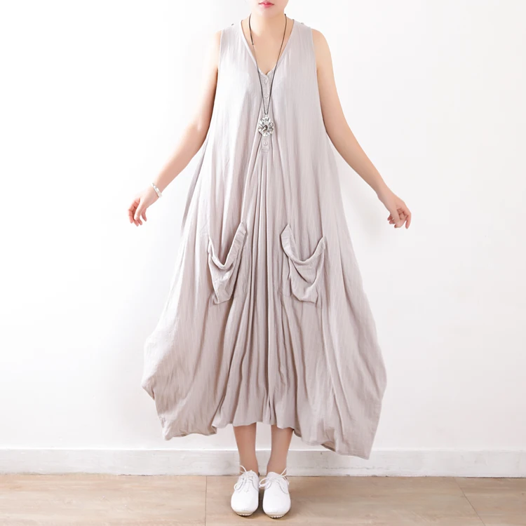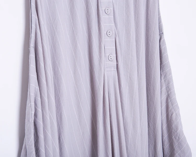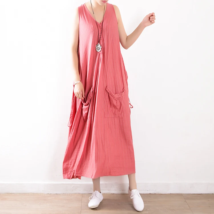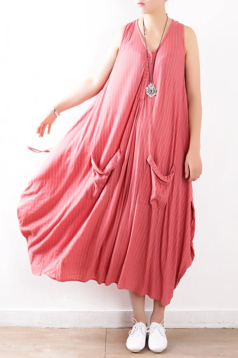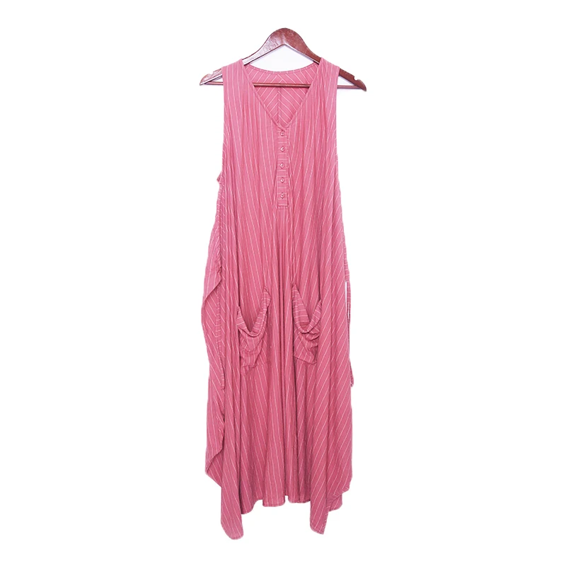 New Summer Originally Designed Flexible Large Size Holiday Travel Wind Cotton Linen Slender Stripe Pocket Dress